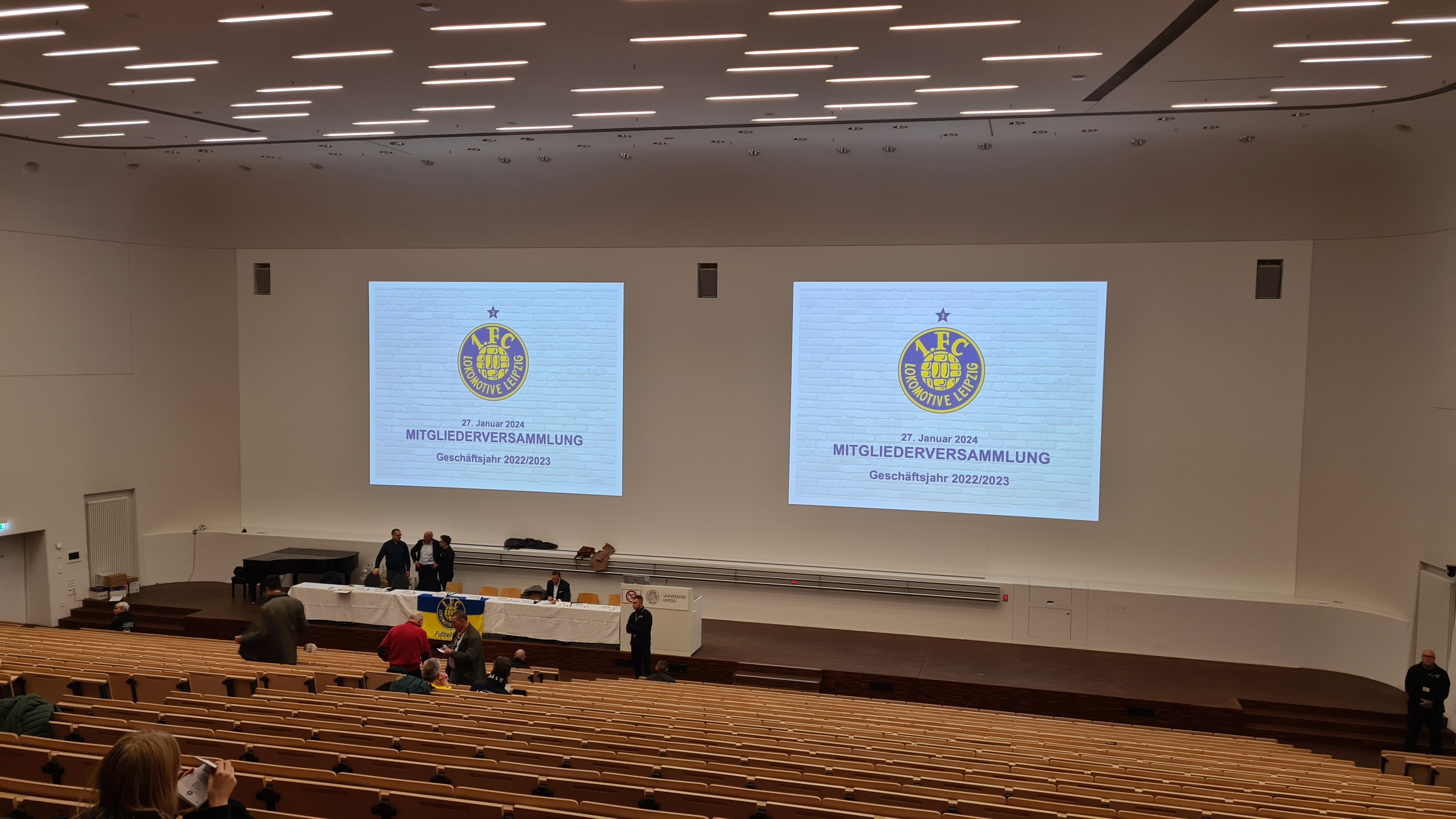 Am Sonnabend lud der 1. FC Lokomotive Leipzig zur ordentlichen Mitgliederversammlung für das Geschäftsjahr 2022/2023 ein. Im Audimax, dem größten Hörsaal der Universität Leipzig, versammelten sich früh um neun 392 stimmberechtigte Mitglieder, darunter auch unsere Herren-Regionalligamannschaft inklusive Trainer und Betreuer.