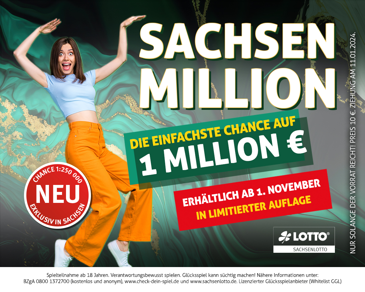 Die geniale Chance auf eine Million Euro: Die Sächsische Lotto-GmbH führt am 1. November eine neue und aufregende Lotterie ein: Die "Sachsen Million". Damit ist der nächste Millionengewinn in Sachsen sicher.