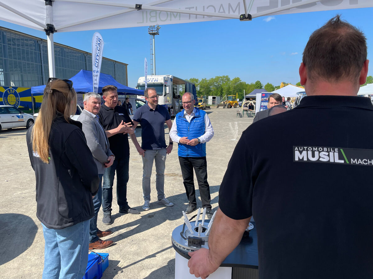 Bagger, Busse, Autos, ein schwebender Dachstuhl und noch viel mehr durften die Besucher auf dem Gelände des Bruno-Plache-Stadions bewundern und sich bei den Unternehmen von A wie ABR-proligna Holz- & Bautenschutz GmbH bis S wie Systaclean Gebäudereinigung GmbH informieren.